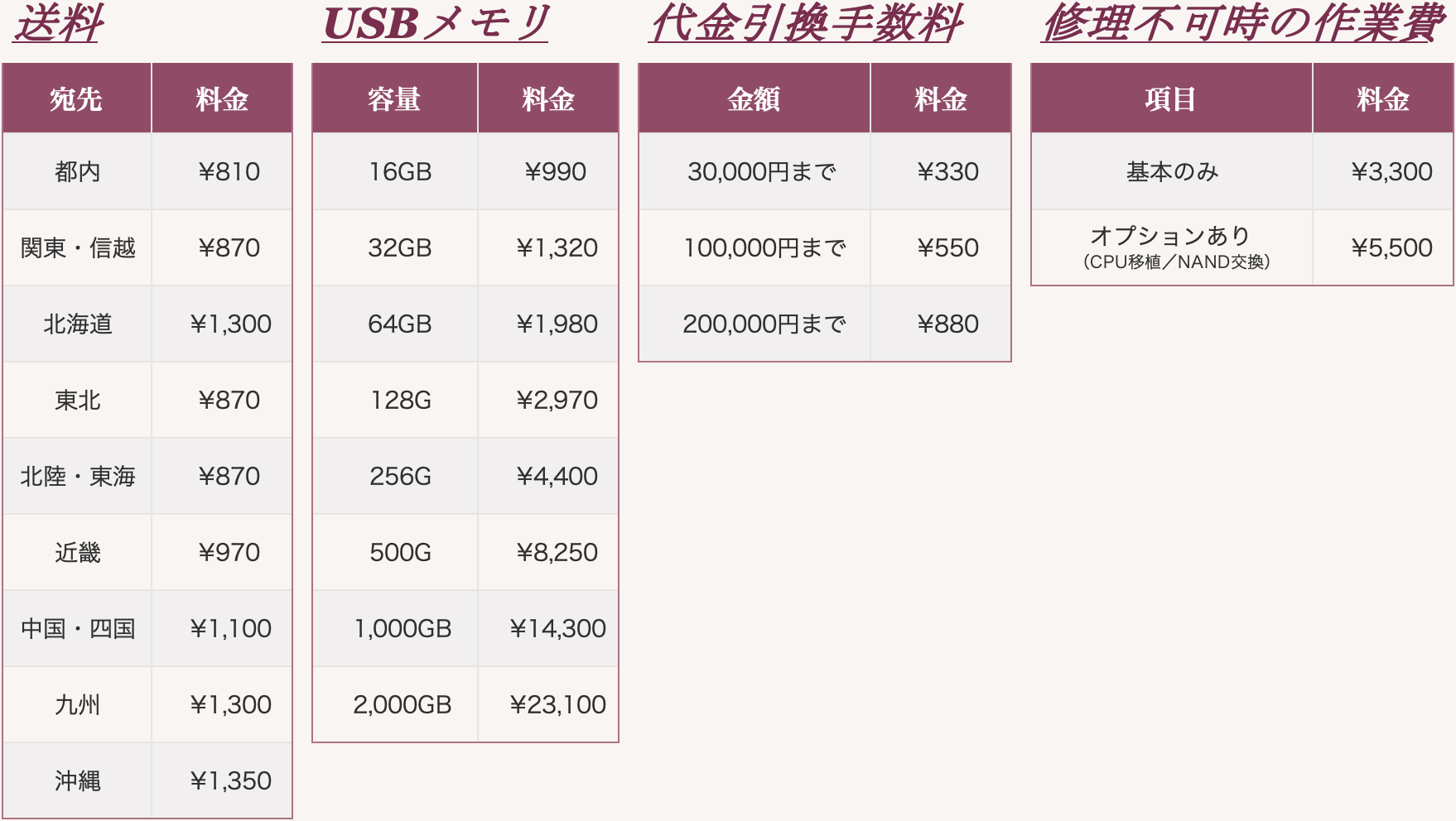 • 「送料」「USBメモリ」「代金引換手数料」「修理不可時の作業費」については当ページ下部の料金表をご参照ください。